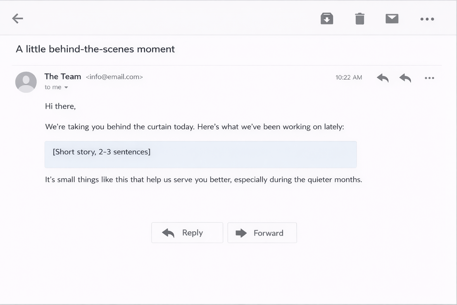Why it works: It builds trust and personality, especially valuable when things are slow.