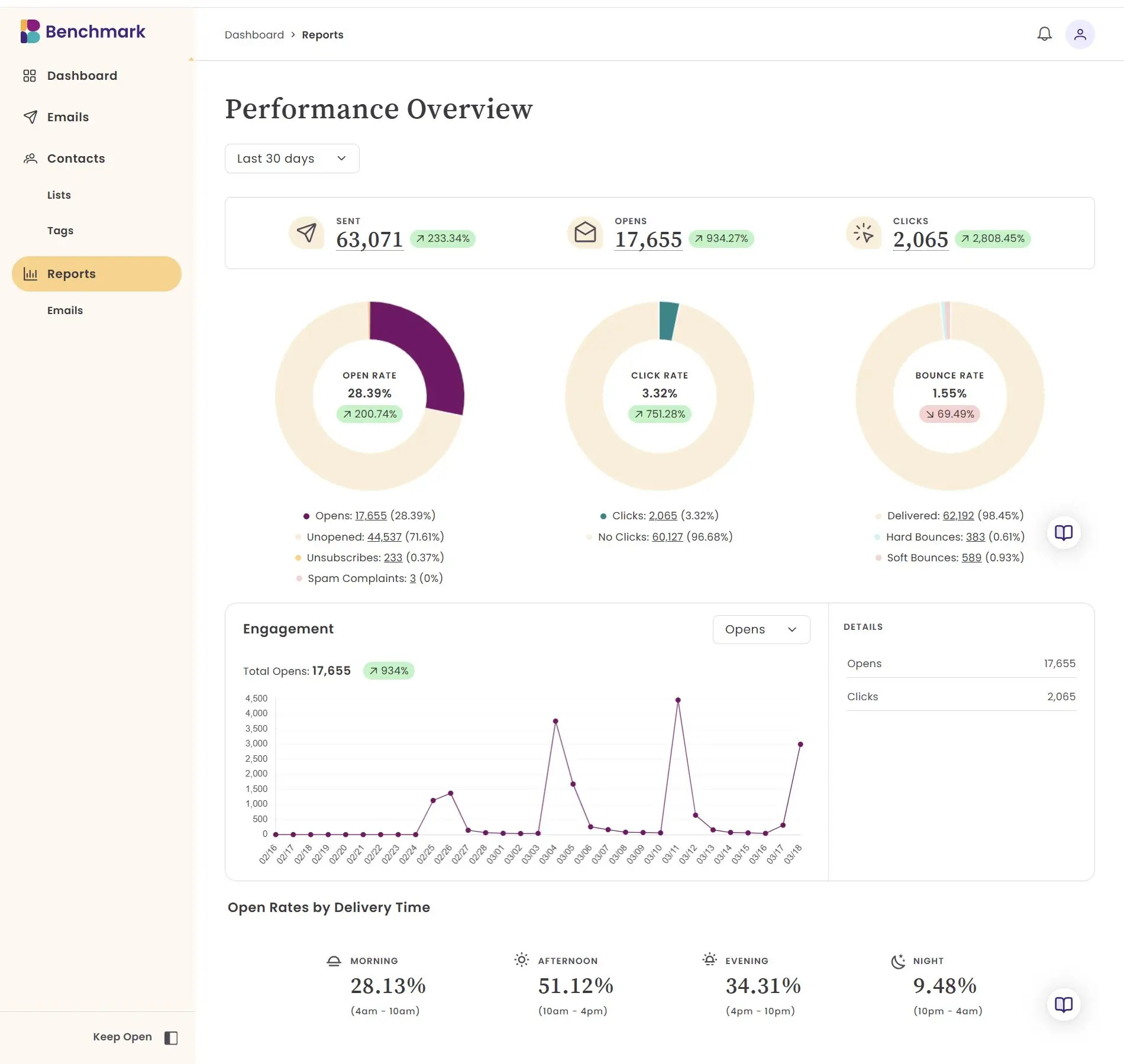 Benchmark’s reporting dashboard gives you all of this at a glance—so you can refine and improve without getting lost in data.