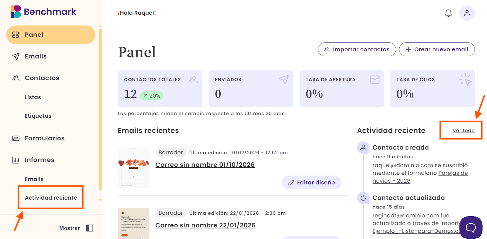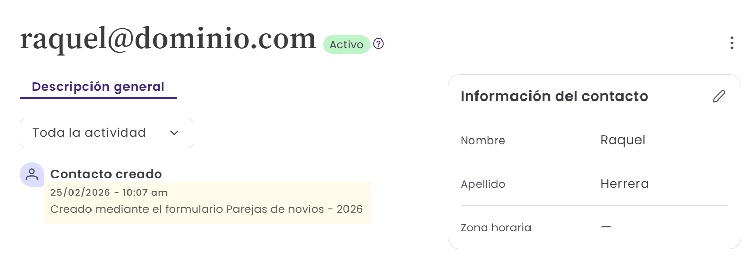 Cada vez que un contacto se suscriba a través de un formulario, lo verás reflejado automáticamente en la Actividad reciente.