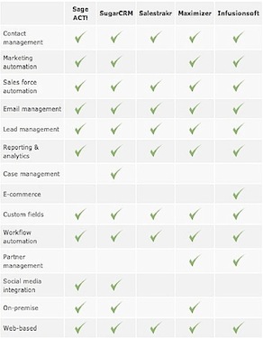 To help you sort through the many available systems, we have compiled a list of our five favorites: Sage ACT!, SugarCRM, Salestrakr5, Maximizer CRM and Infusionsoft. Before we dive into what makes each vendor unique, let’s take a look at the functionality that each vendor offers. You can see a side-by-side functionality comparison in the table on the right.