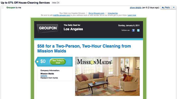 In truth, the subject line read “Up to 57% Off House-Cleaning Services.” Also, the headline on the email was “$58 for a Two-Person, Two-Hour Cleaning from Mission Maids.” Not exactly the free maid service I mentioned above. I’ll get to that now. Directly below the headline there was a button that read “See Today’s Deal” with $0 listed next to it.