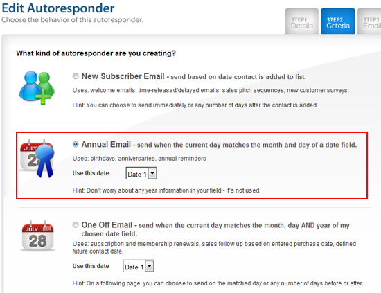 The new autoresponder section isn’t just for birthdays and anniversaries. It also has a one-off-email feature that can also be used for sending emails reminders on or around a date according to month/date AND year. This is useful to automatically handle things like subscription renewals, purchase date follow ups and expiring account notices.