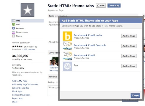 First, you must add an iframe tab to your Facebook Page. To do this, click Add to My Page in the left hand column on the iframe tab app page. A popup window will ask you to decide which of your Pages you would like to add the iframe tab to. Hit Add to Page to select it.