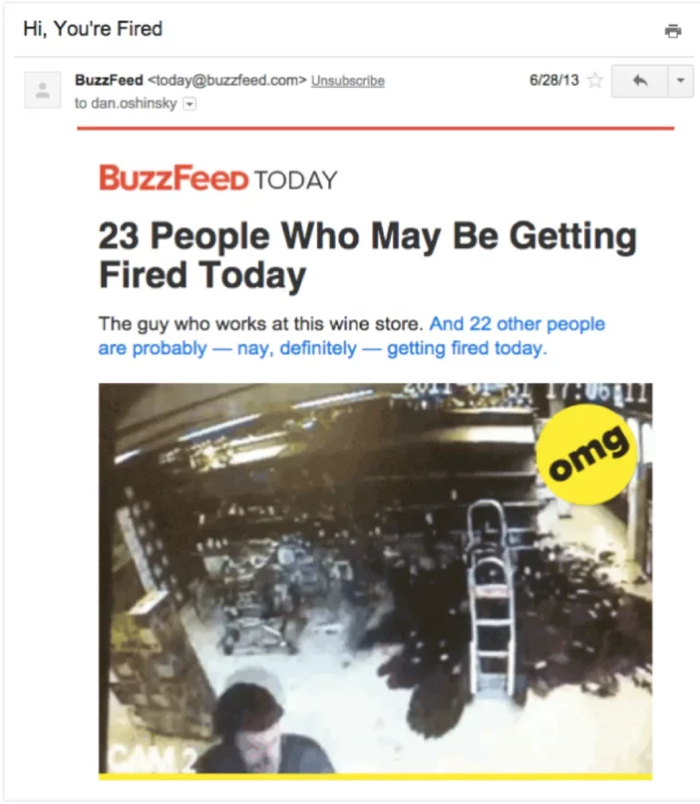 L’oggetto “Ciao, sei licenziato” è sufficiente a far venire a chiunque un brivido di improvviso terrore. Il rappresentante di BuzzFeed responsabile ha confermato che il messaggio è stato uno dei messaggi di posta elettronica più aperti che BuzzFeed abbia mai inviato. Tuttavia, non è difficile capire come l’uso di un oggetto così inquietante possa turbare le persone. Potrebbero persino concludere che BuzzFeed abbia tradito la loro fiducia.