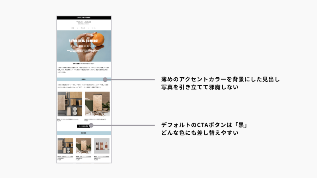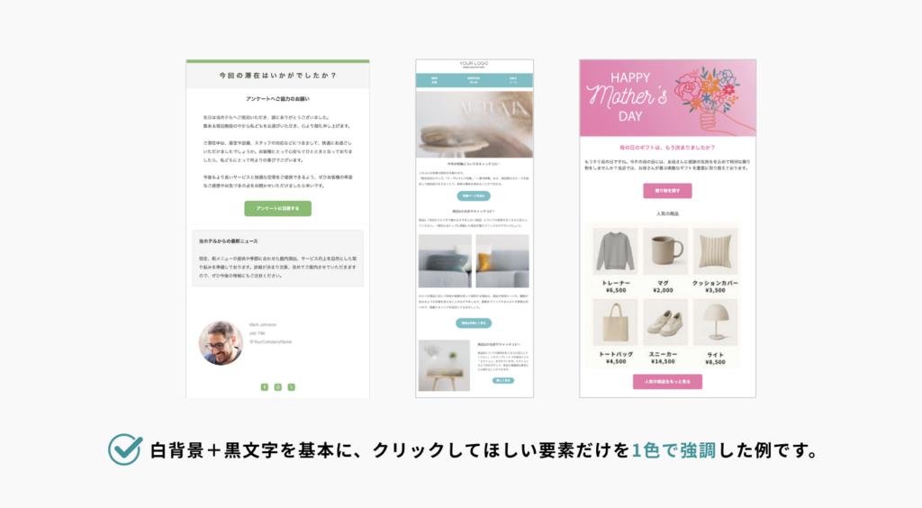 ブランドに合った「1色のアクセントカラー」を繰り返し用いることで、印象に残るメルマガを簡単に作れます。