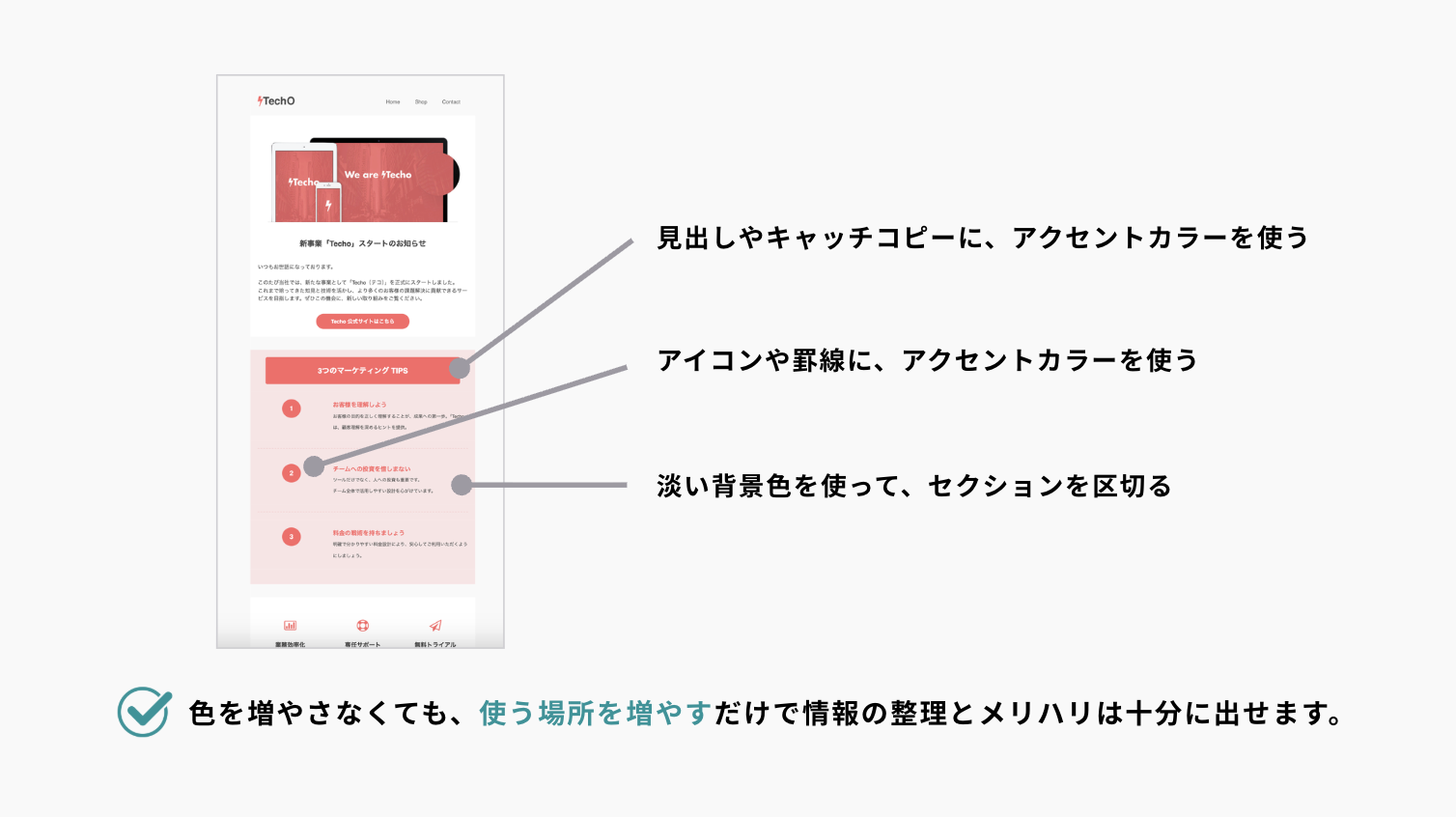 - 見出しやキャッチコピーに、アクセントカラーを使う