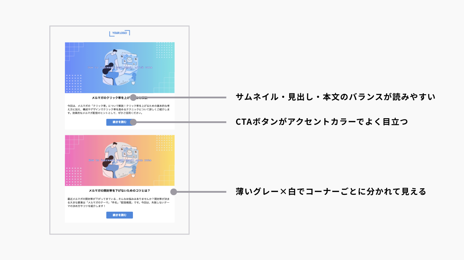 ただし、文章を中心としたメルマガでは「セクションの区切りが分かりづらい」「重要なポイントが目立たない」と感じることもあるでしょう。