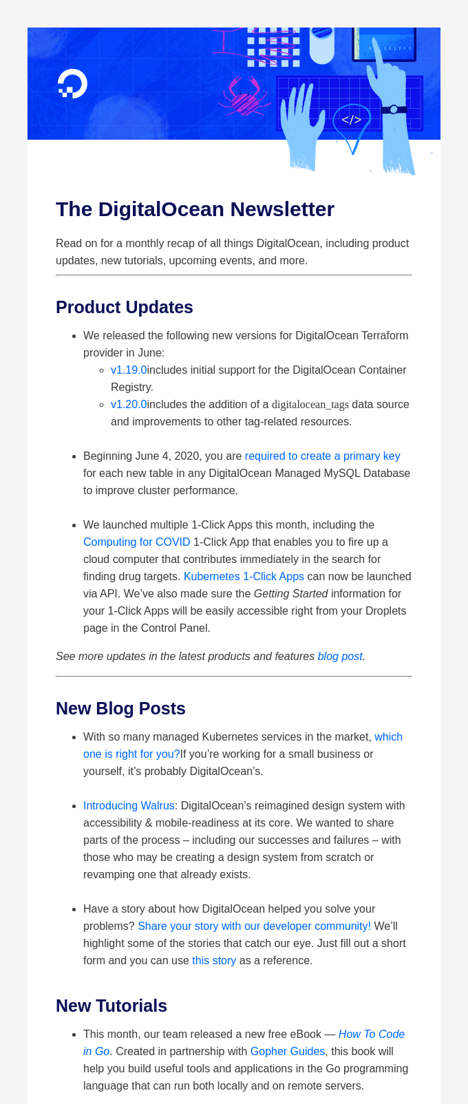 月次で送られているマンスリーアップデートのお知らせ(右側)は、形式化されていて使い回しができるデザインです。楽しいヘッダイラストのあとに責任者からのメッセージ、それから具体的なアップデート内容へと話が進む構成です。
