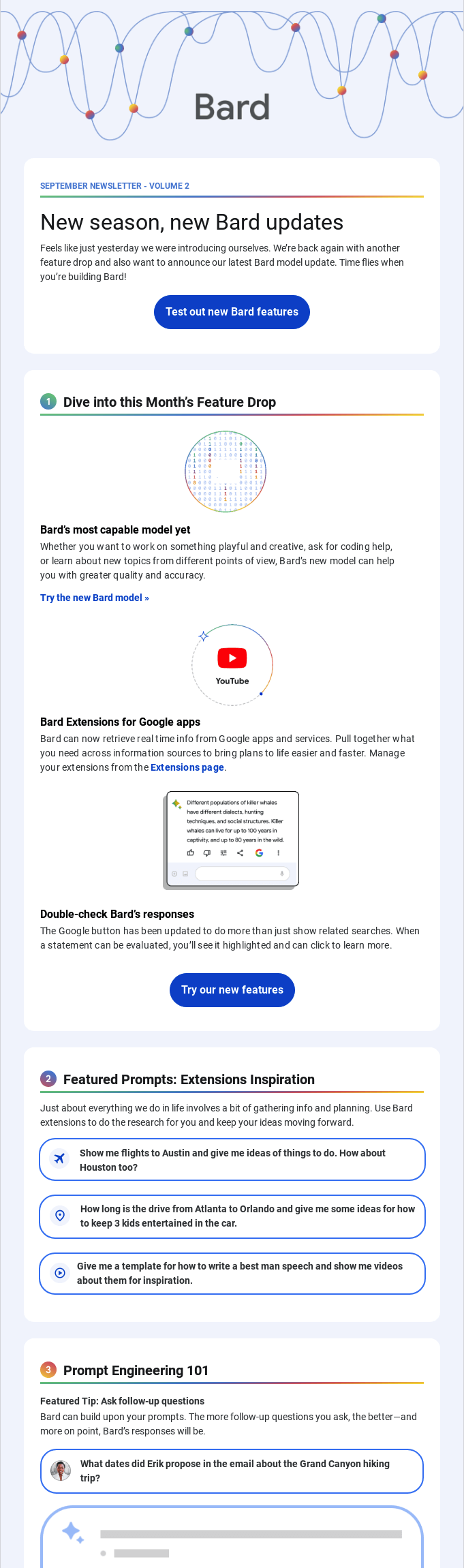 Googleが提供する生成AI「Bard」に関するアップデートメールで、新しいAIモデルや拡張機能の追加など、主にAI活用に関心のあるユーザーや開発者向けの情報を発信しています。
